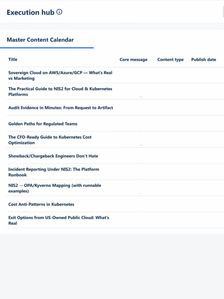 Market signals shape content pillars, talking points, and target channels. Your idea backlog is prioritized and mapped to journey stages.